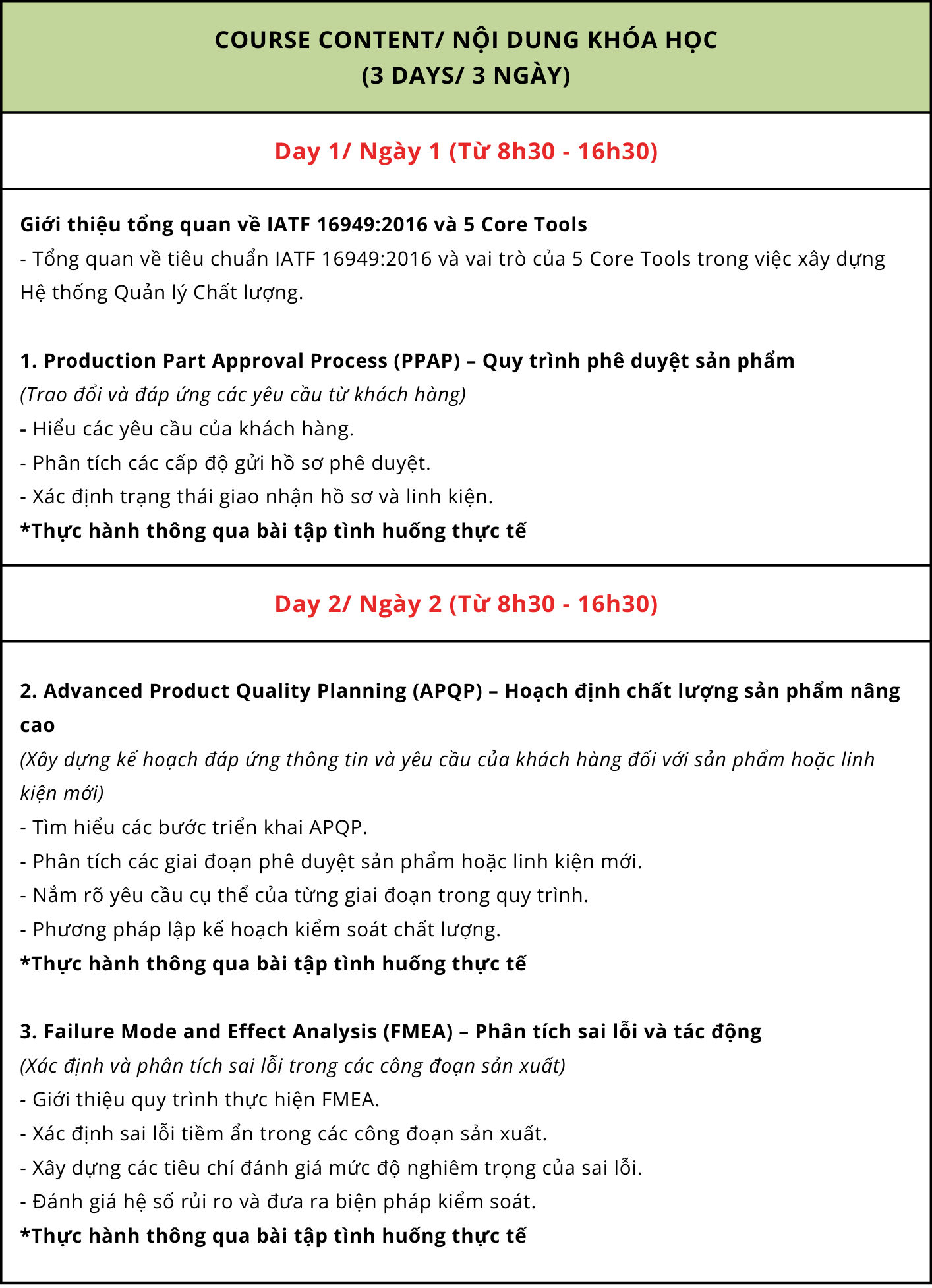 - Biết cách áp dụng từng công cụ trong 5 Core Tools để xây dựng hệ thống phù hợp với tiêu chuẩn IATF 16949.