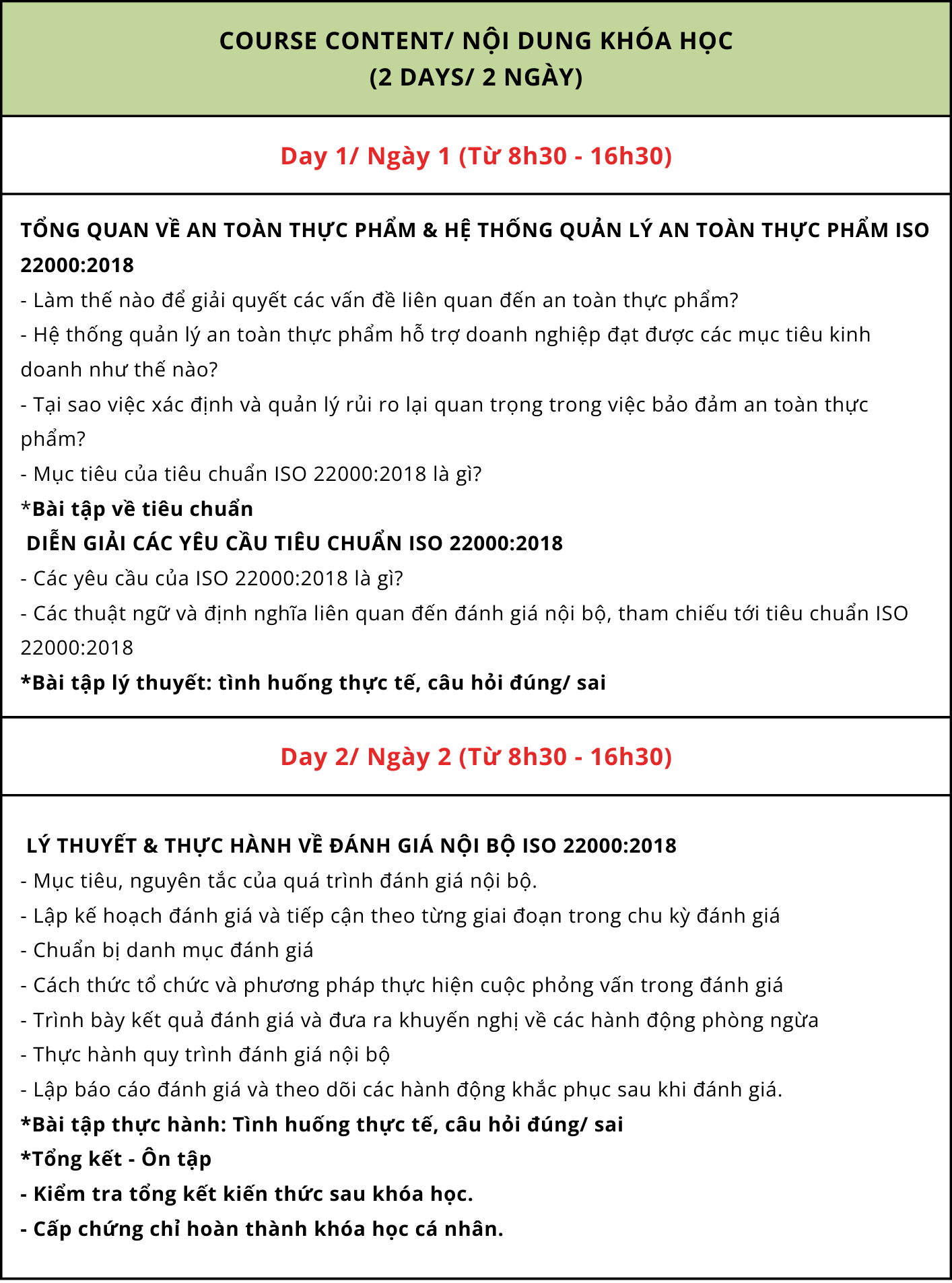 - Khóa học cung cấp kiến thức về Hệ thống Quản lý An toàn Thực phẩm ISO 22000:2018, bao gồm các yêu cầu tiêu chuẩn, thuật ngữ được cập nhật mới và cấu trúc của tiêu chuẩn.