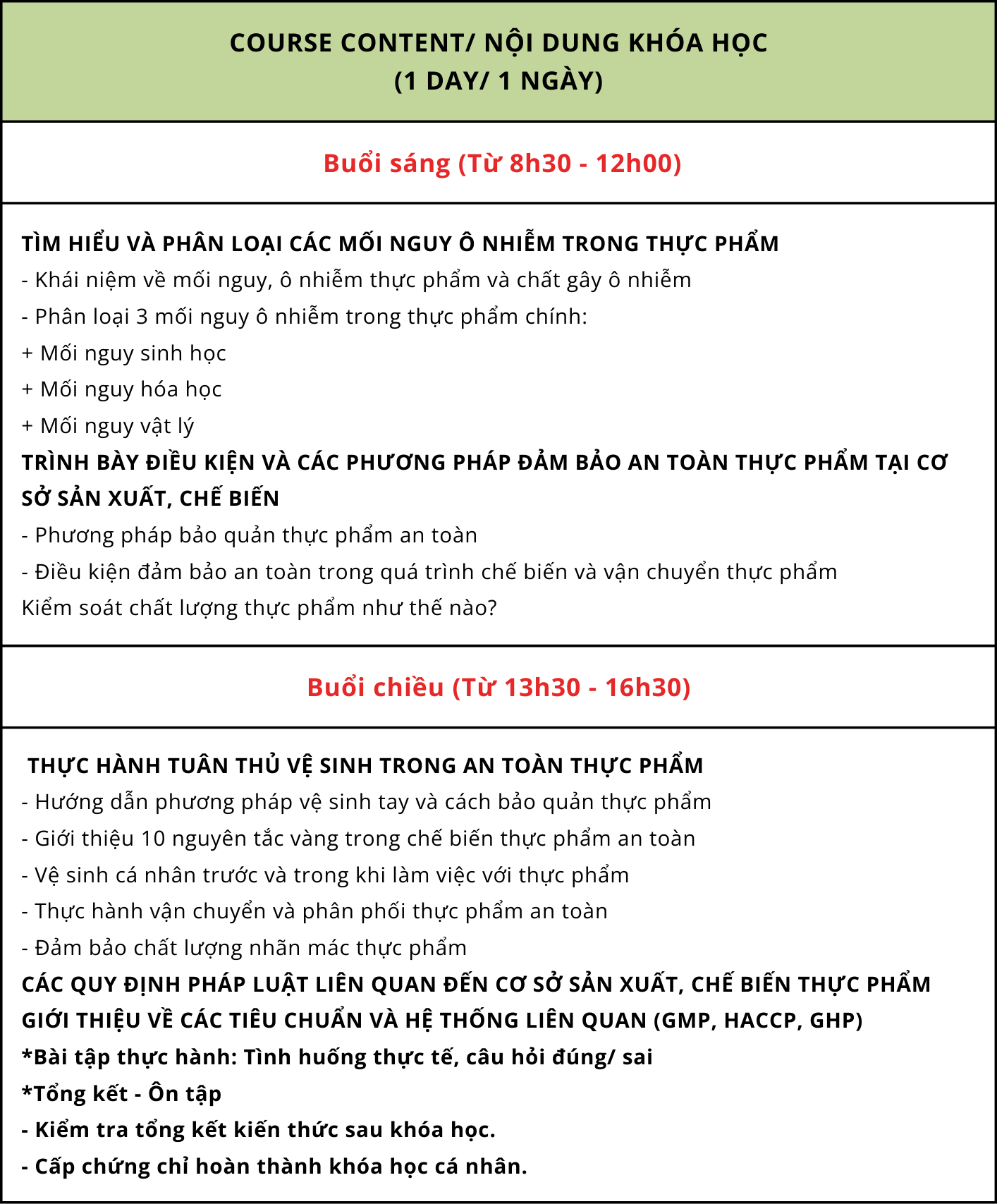 - Khóa đào tạo cung cấp kiến thức cơ bản về các mối nguy ô nhiễm thực phẩm, điều kiện và phương pháp đảm bảo an toàn trong sản xuất, chế biến và bảo quản thực phẩm.