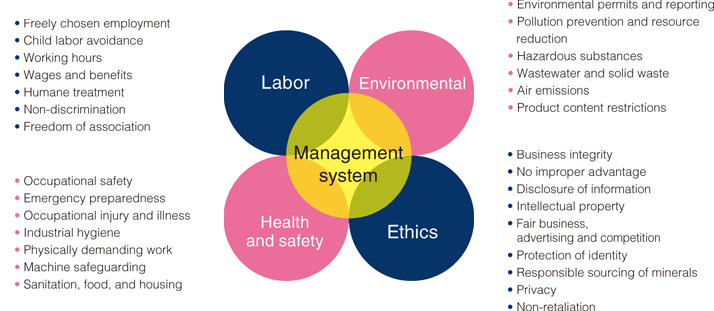 Bộ Quy Tắc Ứng Xử của EICC đưa ra các tiêu chuẩn để đảm bảo rằng điều kiện làm việc trong chuỗi cung ứng của ngành điện tử được an toàn, người lao động được đối xử một cách xứng đáng và tôn trọng, các hoạt động kinh doanh có trách nhiệm với môi trường và được thực hiện một cách có đạo đức.
