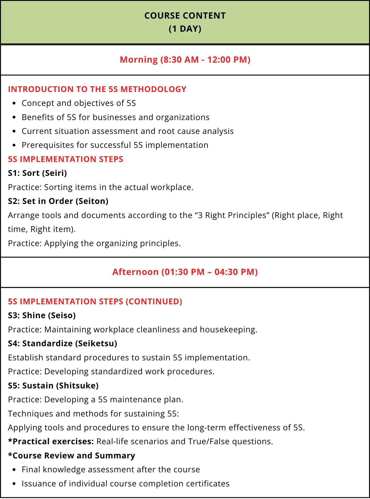 - The course covers the five steps of 5S: Sort, Set in Order, Shine, Standardize, and Sustain, along with techniques for maintaining 5S effectively over the long term.