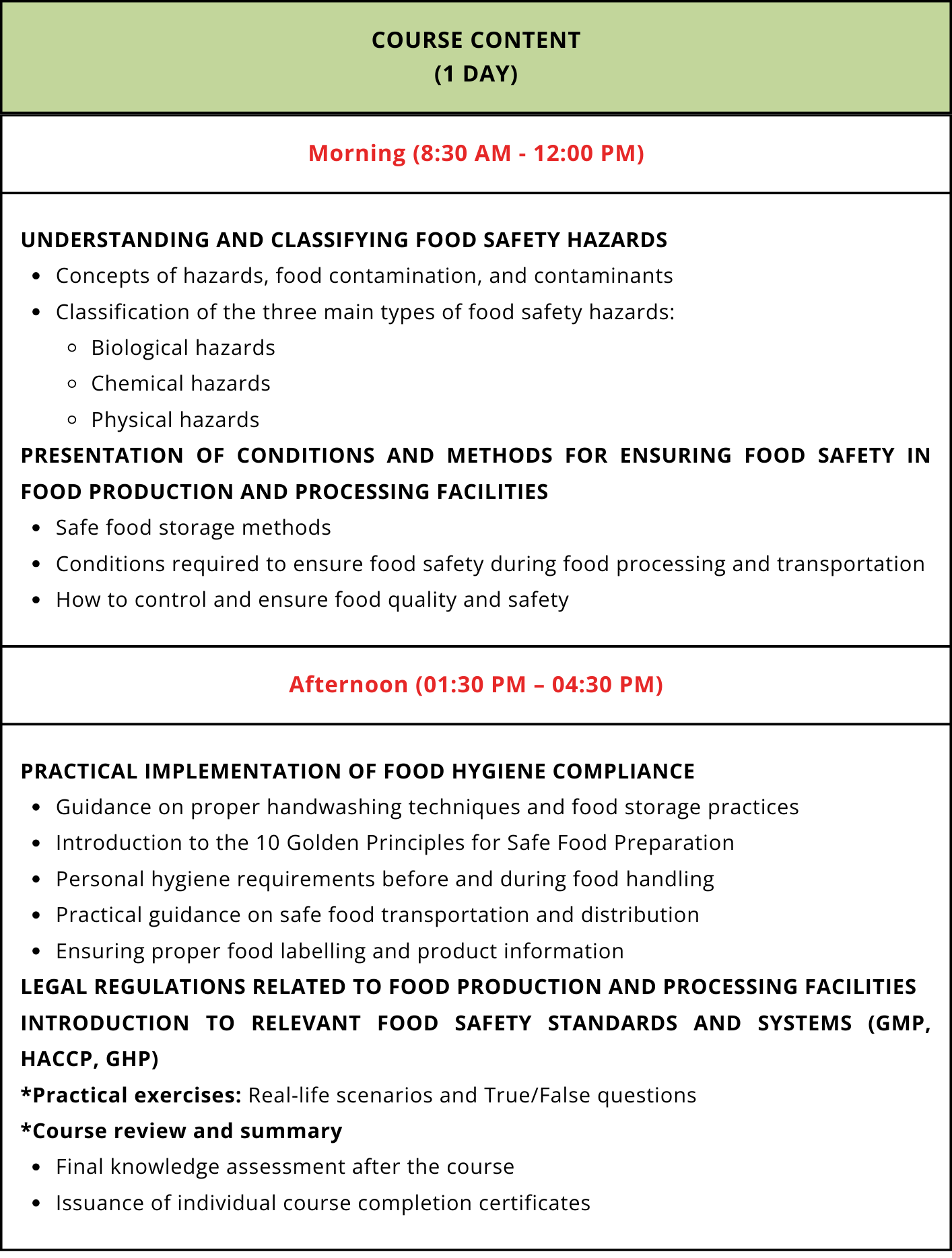 - The training course provides basic knowledge of food contamination hazards, as well as conditions and methods required to ensure food safety during food production, processing, and storage.
