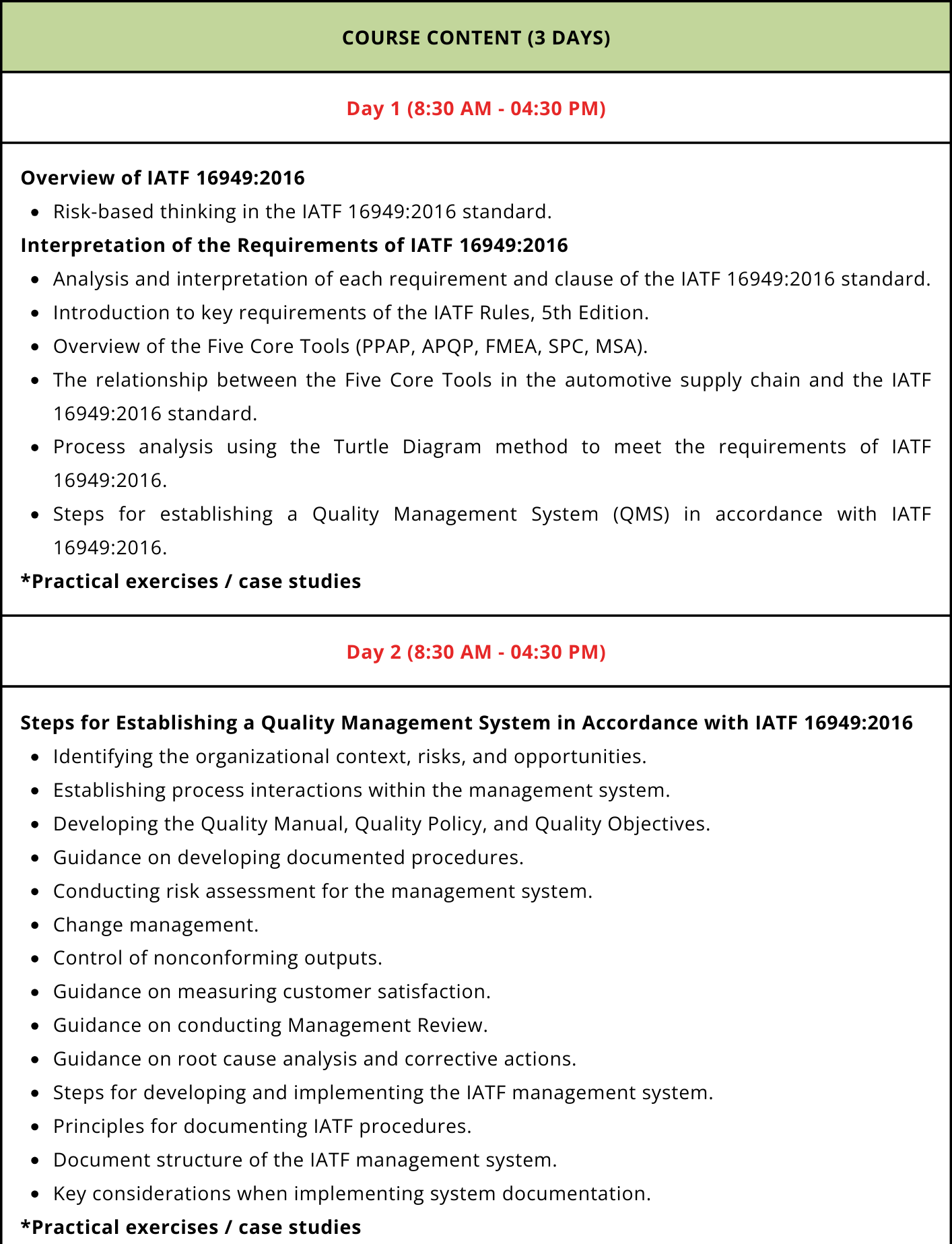 - Ability to apply knowledge to develop and implement a Quality Management System in accordance with IATF 16949 requirements