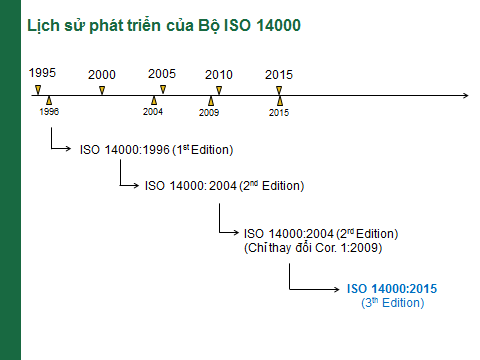 ISO 14001:2015 là gì? ISO 14001 là Tiêu chuẩn quốc tế về hệ thống quản lý môi trường được ban hành lần đầu vào năm 1996, lần thứ 2 vào năm 2004 và lần thứ 3 mới đây nhất là vào tháng 9 năm 2015.