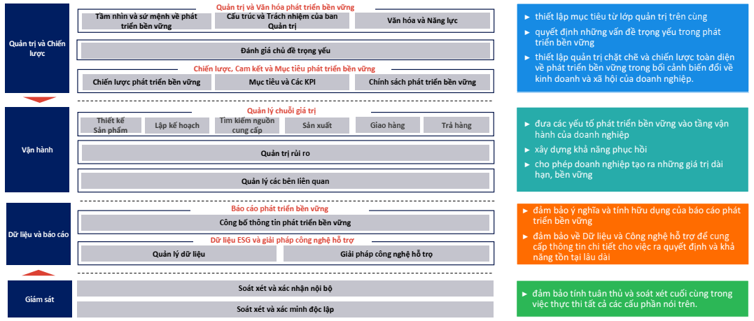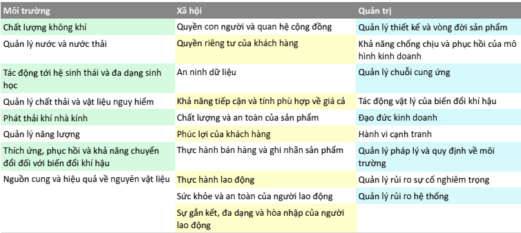 - Các chủ đề trọng yếu trong phát triển bền vững: bao gồm rủi ro, tác động và cơ hội ESG đến từ vận hành và chuỗi giá trị của doanh nghiệp.