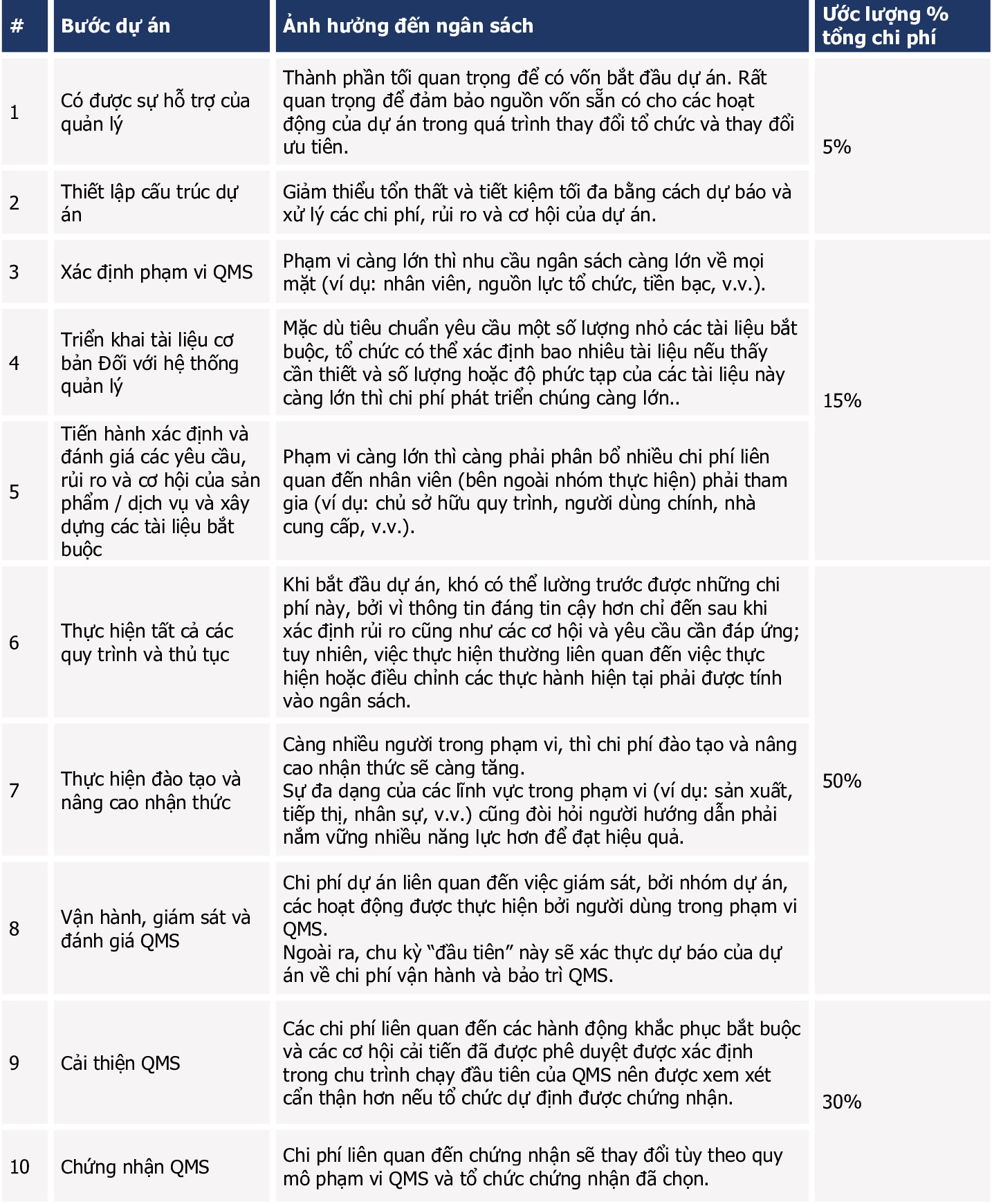 - Các chi phí ban đầu liên quan đến việc thực hiện QMS, trong đó các phương pháp lập ngân sách có thể giúp bạn lập kế hoạch và kiểm soát tiến độ của dự án, bằng cách xác định các rủi ro và cơ hội liên quan đến chi phí dự án trước khi chúng xảy ra, để chúng có thể được xử lý thích hợp để tối đa hóa cơ hội thành công của dự án.