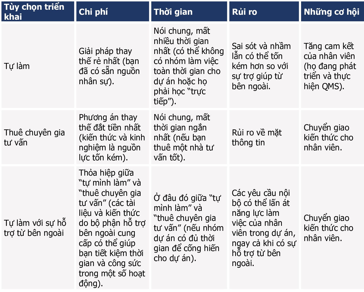 Các lựa chọn thay thế khả thi mà một tổ chức có để thực hiện một dự án tư vấn ISO 9001, như đã nêu ở phần đầu của bài báo này, là: