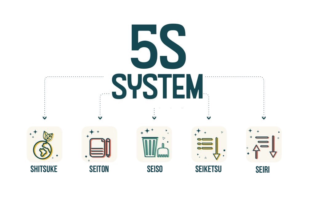 5S được viết tắt từ 5 từ của tiếng Nhật là Seiri (Sàng lọc), Seiton (Sắp xếp), Seiso (Sạch sẽ), Seiketsu (Săn sóc) và Shitsuke (Sẵn sàng).