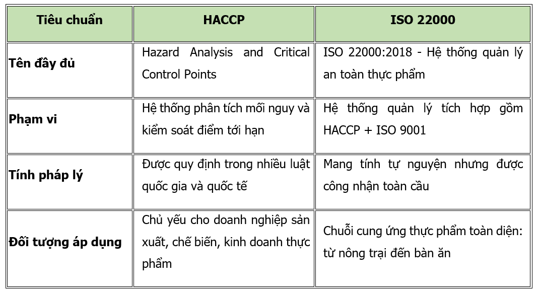 Trong bối cảnh thị trường ngày càng cạnh tranh, đặc biệt trong ngành thực phẩm và đồ uống, việc áp dụng các hệ thống quản lý an toàn thực phẩm là yếu tố bắt buộc nếu doanh nghiệp muốn nâng cao uy tín thương hiệu, tuân thủ quy định pháp luật và mở rộng cơ hội xuất khẩu. Tuy nhiên, giữa hai lựa chọn phổ biến là chứng nhận ISO 22000 và HACCP, không ít doanh nghiệp còn băn khoăn: Chứng nhận nào phù hợp hơn với mô hình và định hướng phát triển của mình?