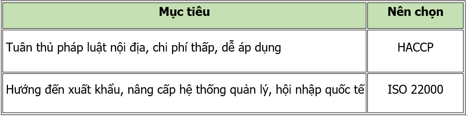Nếu doanh nghiệp của bạn đang ở quy mô nhỏ và chủ yếu phục vụ thị trường nội địa, HACCP là lựa chọn phù hợp, giúp bạn kiểm soát mối nguy hiệu quả mà không tốn kém quá nhiều chi phí và thời gian. Tuy nhiên, nếu bạn hướng đến xuất khẩu hoặc muốn xây dựng hệ thống quản lý chuyên nghiệp, đồng bộ, thì ISO 22000 là sự đầu tư chiến lược dài hạn.