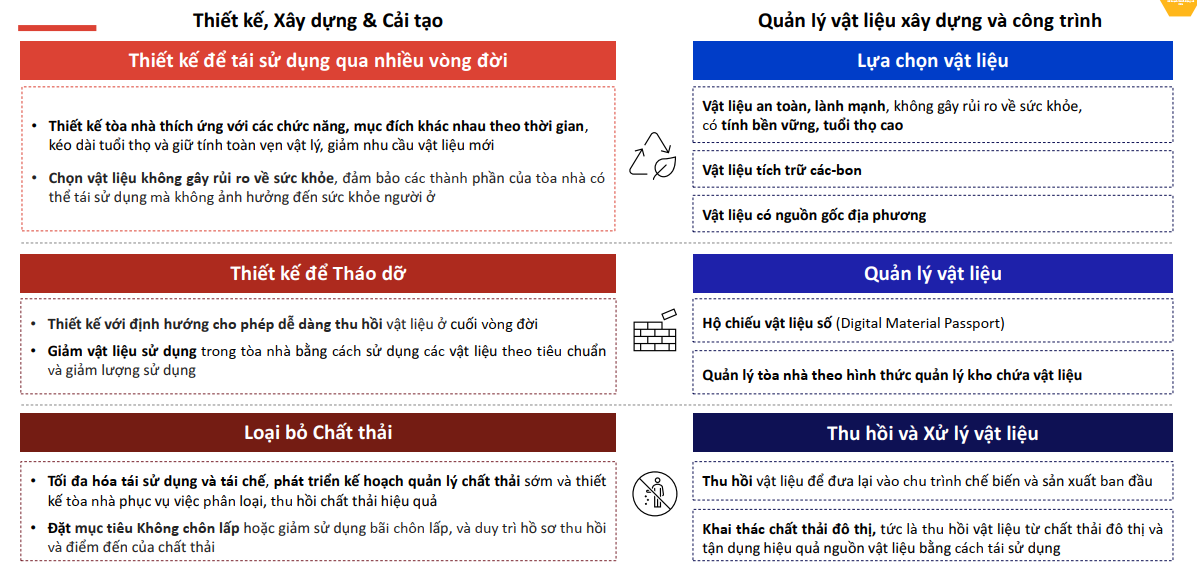 + Quản lý Vật liệu xây dựng và công trình: (i) Giảm tiêu thụ vật liệu và tài nguyên, (ii) Tối ưu hoá tuổi thọ sử dụng vật liệu và sản phẩm