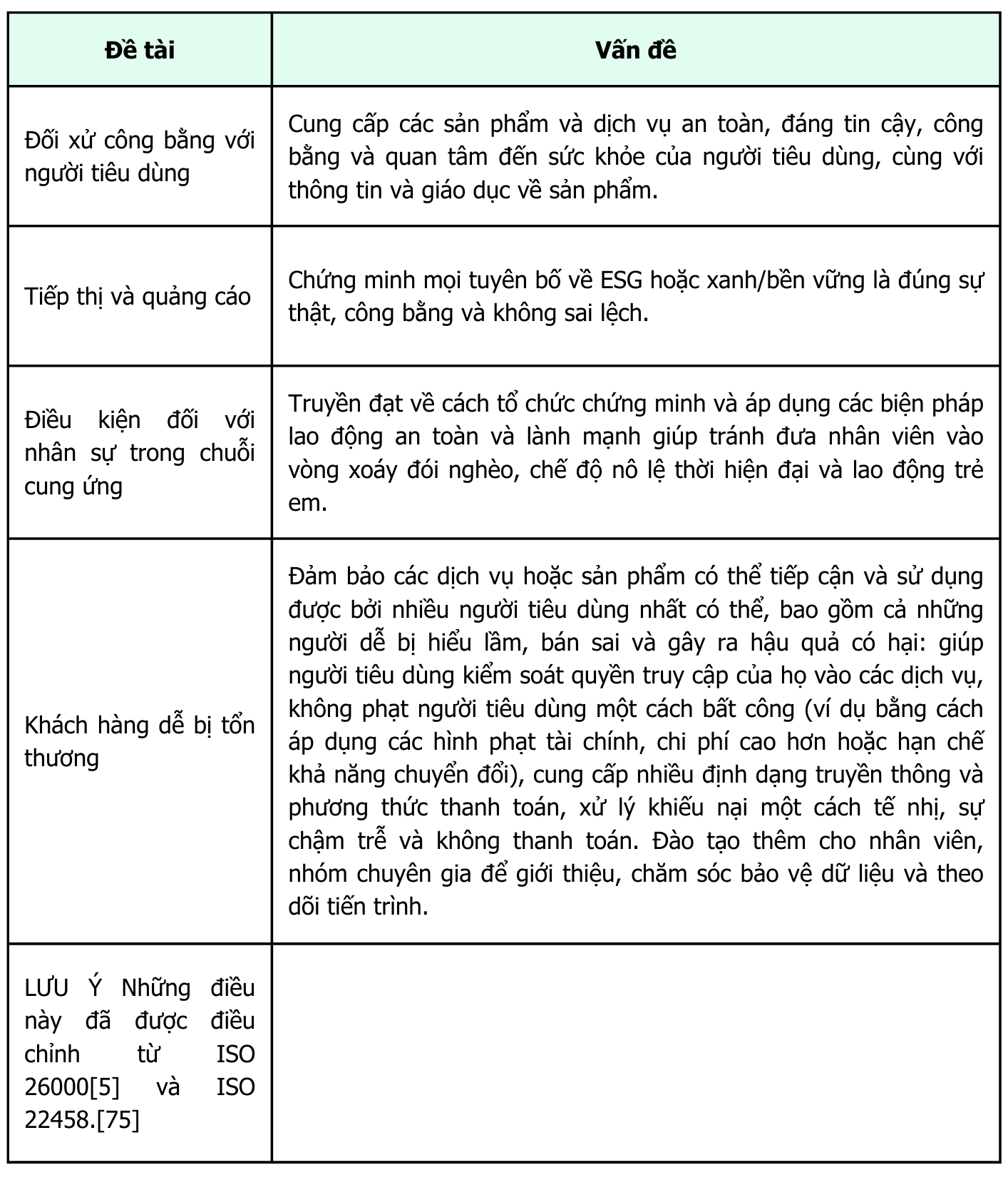 Trong khi các Tiêu chuẩn quốc tế hiện hành giải quyết nhiều vấn đề trong danh mục đầu tiên, danh mục thứ ba đòi hỏi sự tập trung và hiểu biết bổ sung về cách tiếp cận ESG của tổ chức. Các tổ chức và cá nhân sẽ cần phải làm việc chặt chẽ với nhau. Có thể cần các biện pháp KPI mới (xem 4.6) và quản trị sẽ đòi hỏi sự thay đổi về tư duy và văn hóa (xem 7.6).