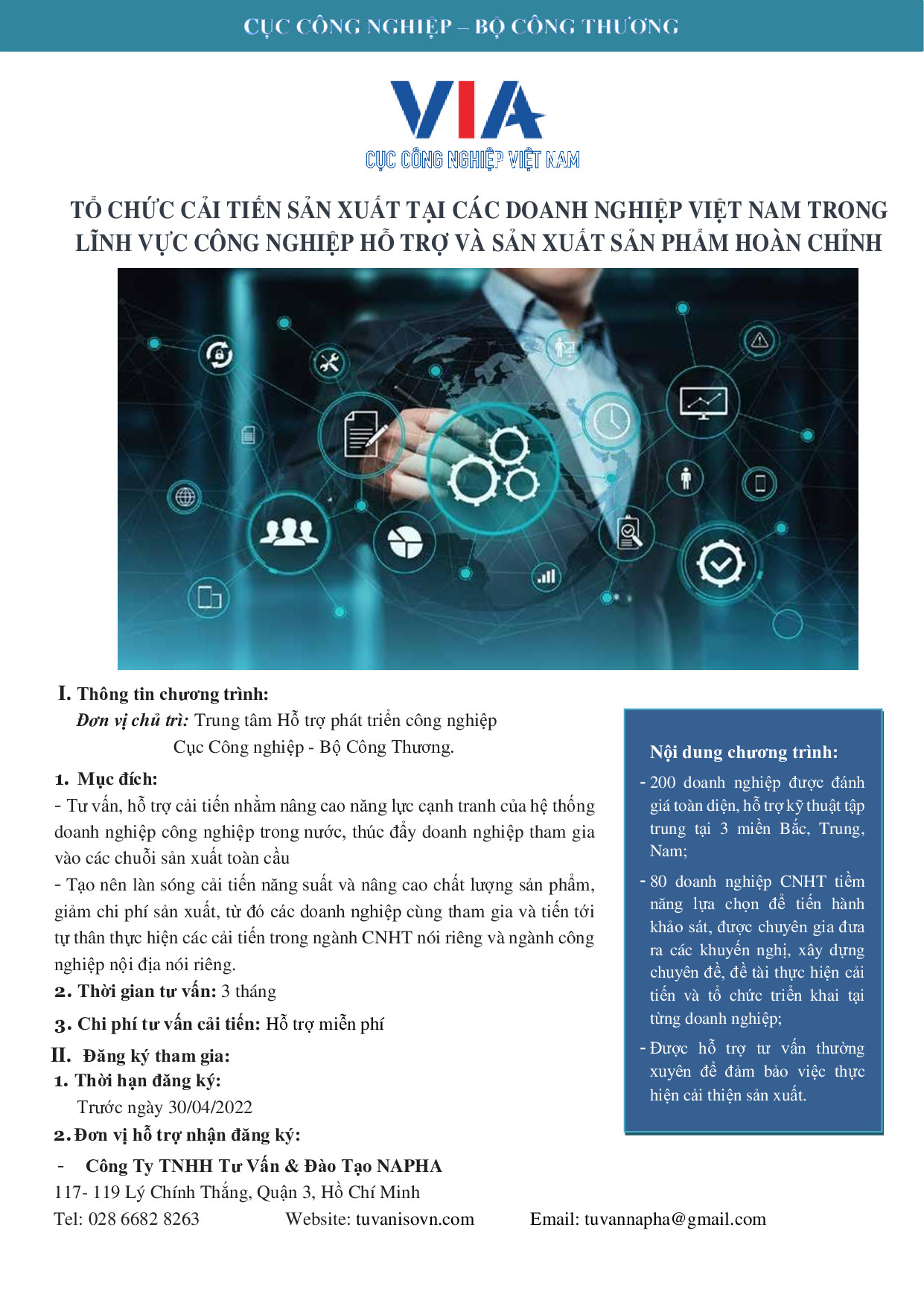 NAPHA kết hợp và triển khai cùng Trung tâm hỗ trợ phát triển công nghiệp – Cục Công Nghiệp về chương trình tổ chức Tư vấn 5S-3D - Cải tiến sản xuất tại các doanh nghiệp Việt Nam trong lĩnh vực Công nghiệp hỗ trợ và sản xuất sản phẩm hỗ trợ.