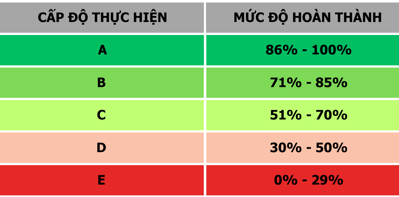Xếp hạng của từng khu vực thực hiện của Đánh giá BSCI: giá trị của từng xếp hạng câu hỏi được thêm vào và chuyển đổi thành tỷ lệ phần trăm hoàn thành của từng khu vực thực hiện. Tỷ lệ hoàn thành này xác định đánh giá của từng khu vực thực hiện.