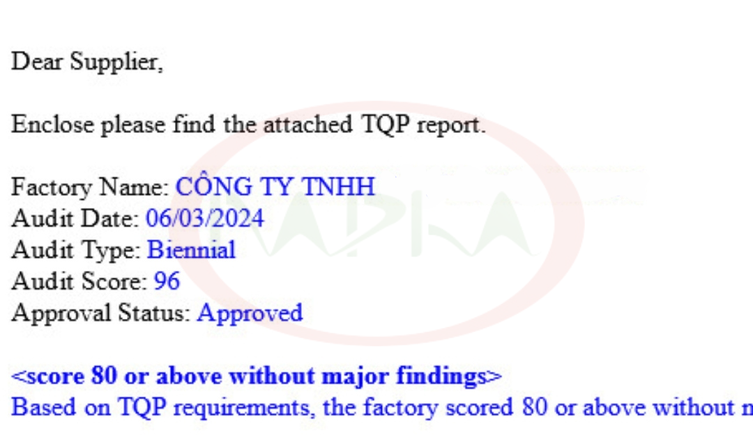 Trích báo cáo đánh giá TQP của Intertek khách hàng do Tư vấn Napha tư vấn đạt số đểm gần như tuyệt đối 96/100 ngay trong lần đánh giá chứng nhận TQP đầu tiên: