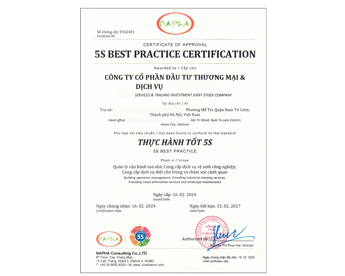Chứng chỉ chứng nhận đã áp dụng Thực hành tốt 5S